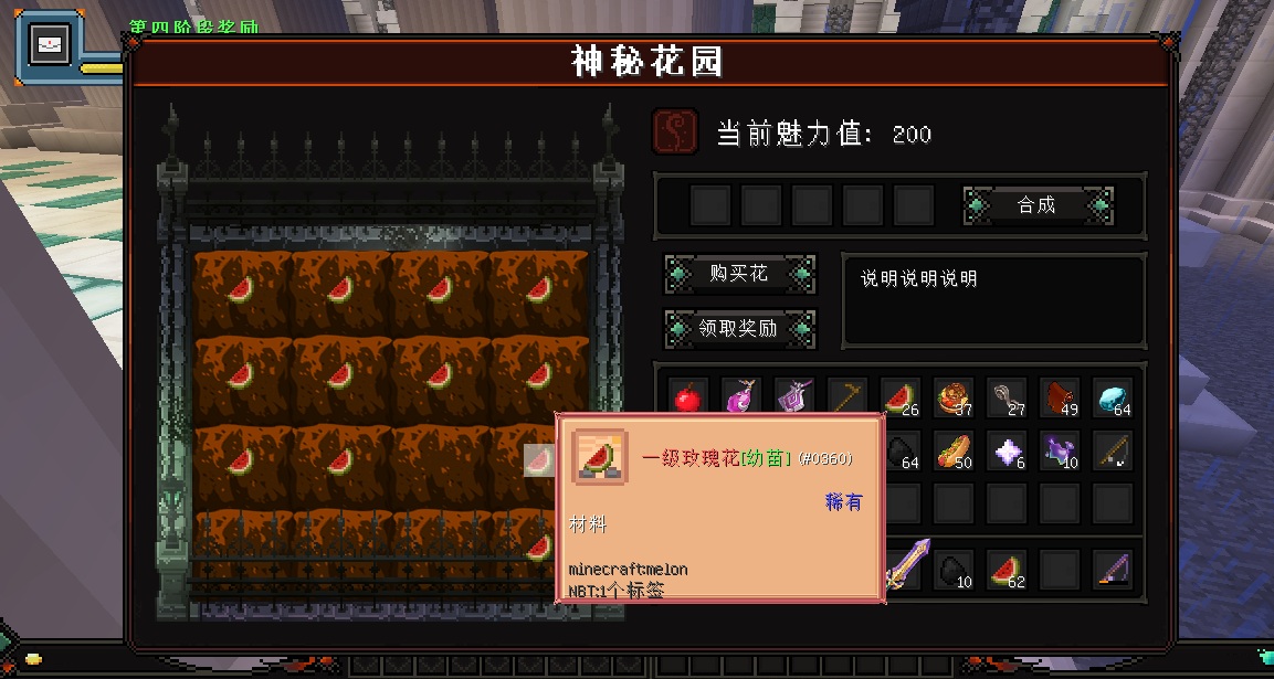 简介: 秘密花园,是一个,种指定花(可配置),成熟收取后增加魅力值(可配置),这个魅力值达到一定值,可以领取物品,同时加入了玩家之间可以互相偷摘的玩法